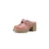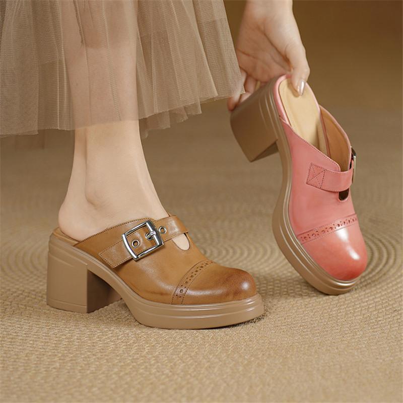 Fashion New Summer Slippers Genuine Leather Slippers for Women Fashion Brogue Mules Round Toe High Heels Cover Toe Slippers Sandals