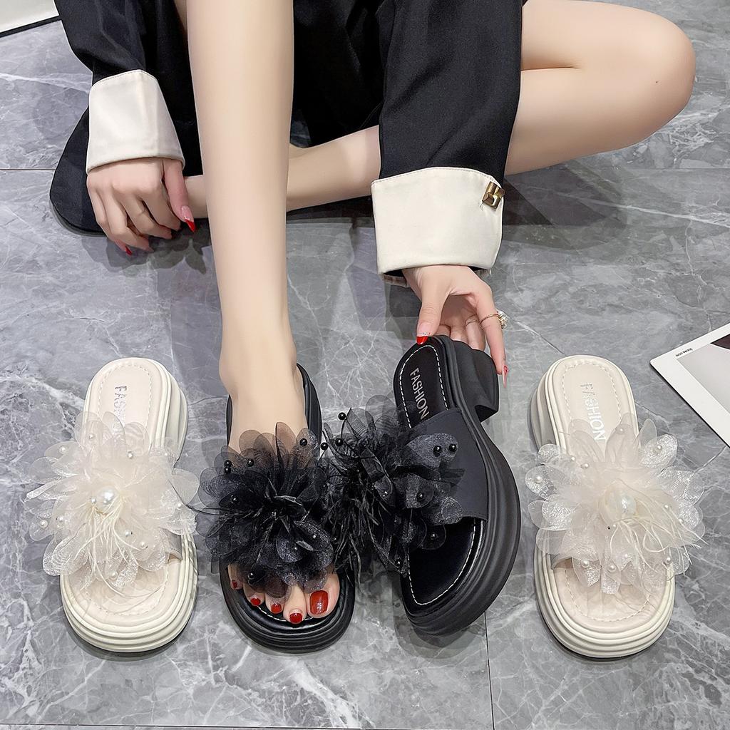 Fashion Square Heel Sandals Big Flower Dec Women Outside Slides Sweet PVC Flip Flops Shoes Zapatos Mujer 2025