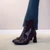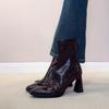 Sheepskin version~ retro bow high-heeled boots small square head temperament thick heel short boots rear zipper elastic thin boots women