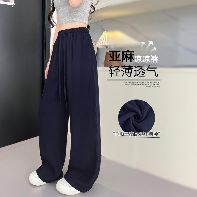 Navy blue tencel linen pants women's summer thin small high waist loose casual cotton and linen wide-leg straight pants