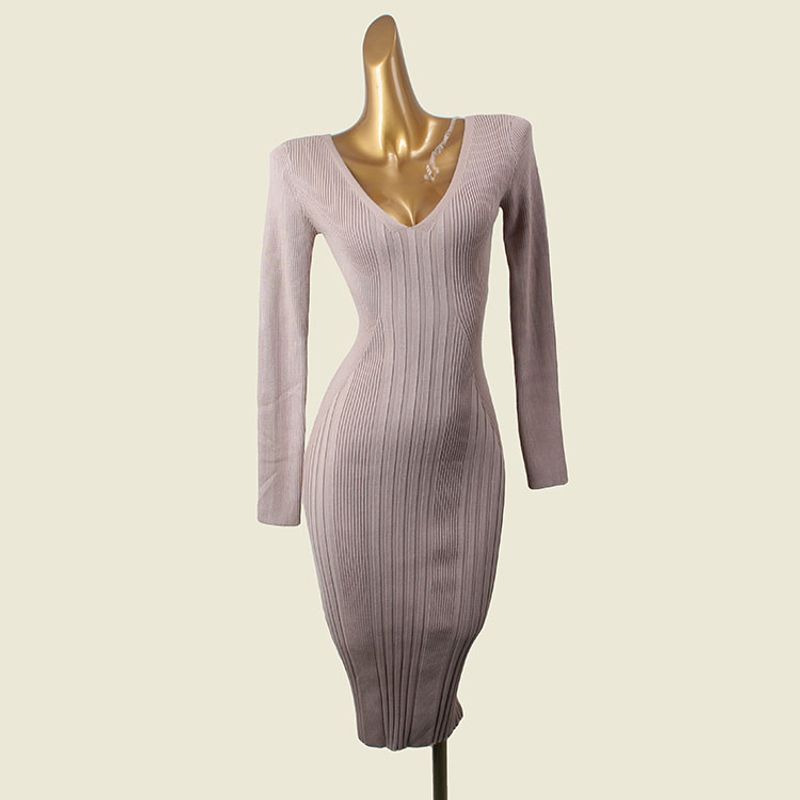 American Brand Fine Rib V-neck Autumn and Winter Base Skirt Foreign Trade Original Order Solid Long sleeve Sheath Slim fit Long dress