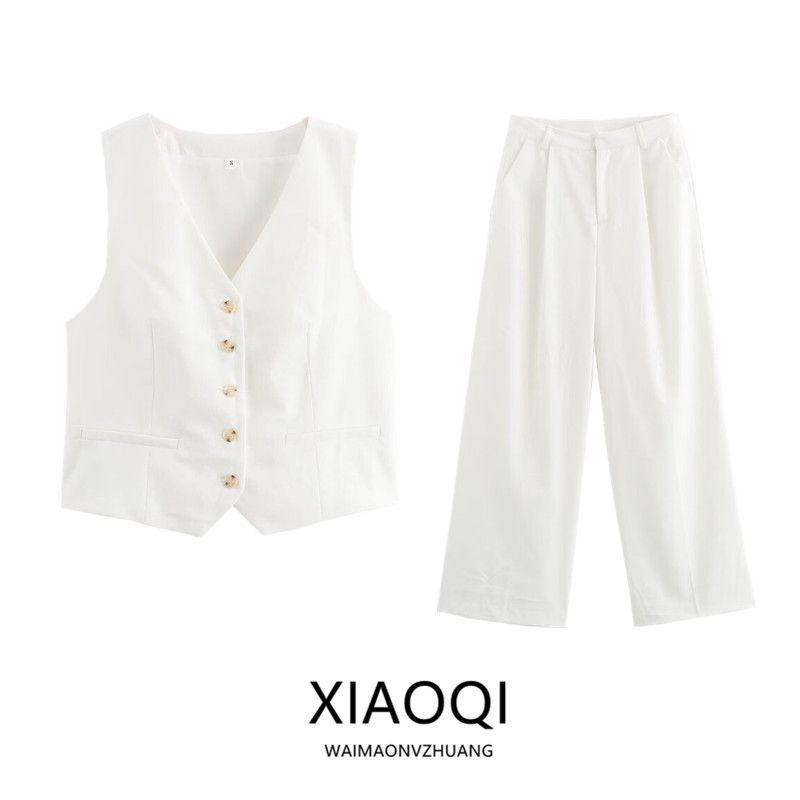 Fashion Style Autumn New Women's Clothing Linen Blend Sleeveless V-neck Vest High Waist Pants 2010765