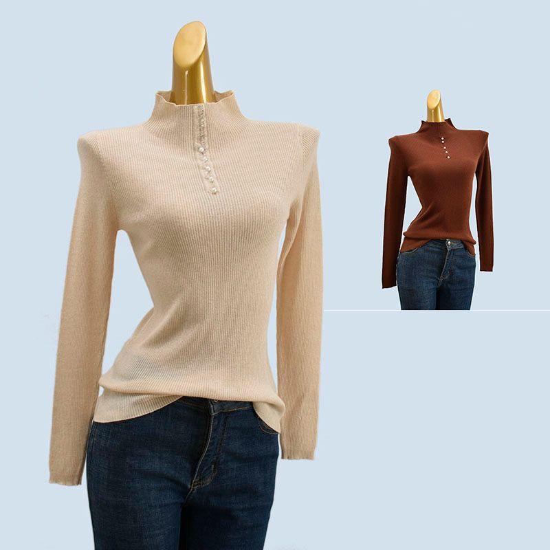 Soft Glutinous Six Wool Shirt Beaded High Elasticity Half-High Collar Long Sleeves Bottoming Shirt Female Slimming Inner Knitting Tops