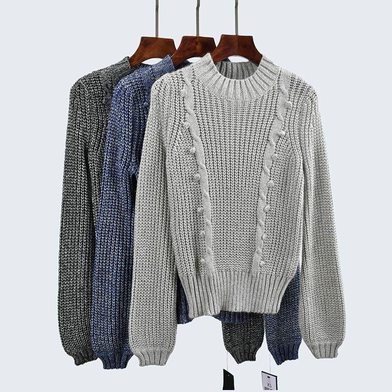 Export Single Autumn Crew Neck Knitting Sweater Silver Thread Stitching Silm Long Sleeves Fashion Style Pullover Bottoming Shirt Women's Clothing