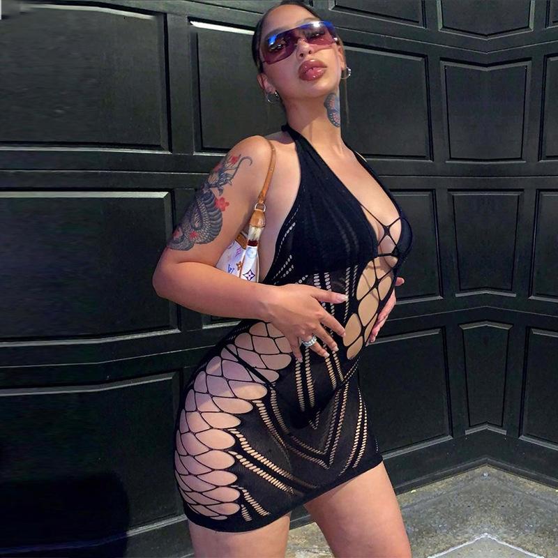 Sexy Fishnet Halter Backless Dress Low Cut Tight Pencil Cute Dress Mini Short Dress Nightclub Dance Dress Dresses For Women