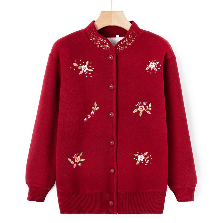 Babiččin podzimní svetr s plusovým sametem, bunda, pletený svetr pro střední a starší věk, vyšívaný top, 60 let, 70, podzimní outfit pro matku, silný styl
