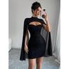 European and American Autumn Black Sexy Hollow out Half-high Collar Slim fit Sheath Shawl Sleeve Bronzing Dress Formal Dress Dress