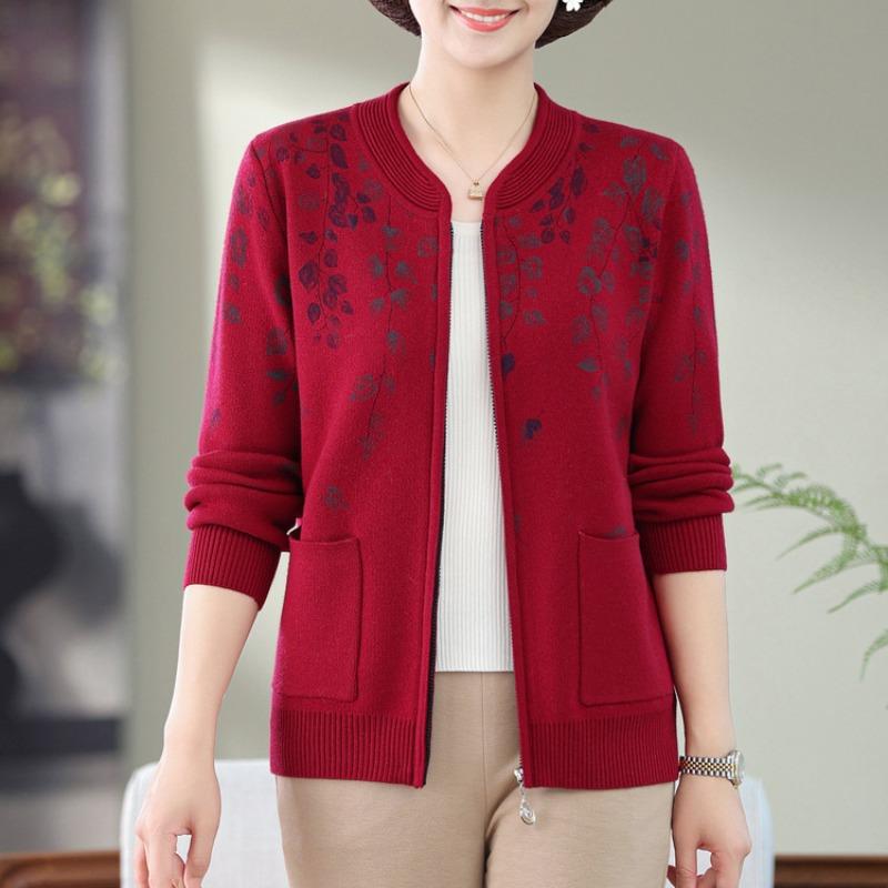Middle-aged mother early autumn new crew neck cardigan middle-aged women's pocket knitted sweater top new sweater