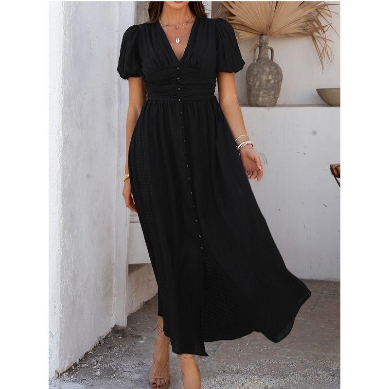 Bohemian Seaside Style Long dress European and American Summer V-neck Single-Breasted Waist Hugging Shoulder Bubble Short sleeve Dress Women