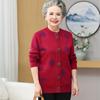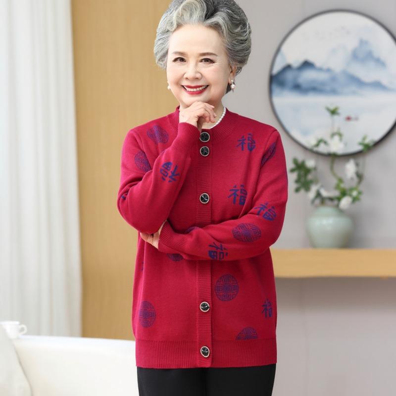 Middle-aged and elderly knitted cardigan female mother crew neck printed long-sleeved jacket autumn and winter loose casual comfortable top