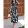 Foreign Trade Export French style Ethnic Style Print Pleat Cotton Silk Dress Women Summer Short sleeve Lace-up Rayon Long dress