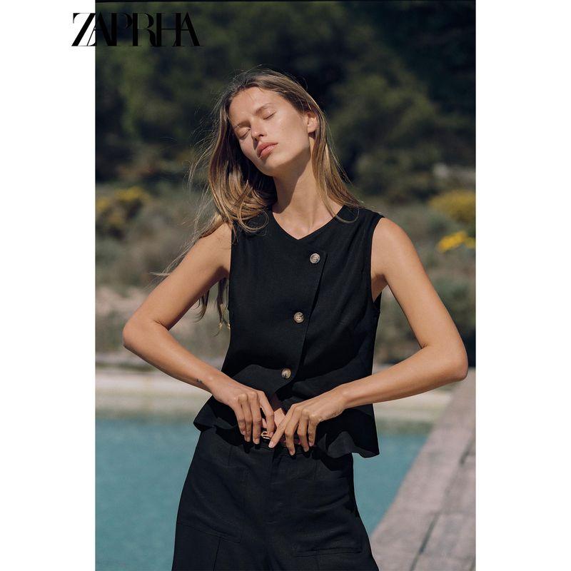 Zaprha 2025 Summer New Asymmetric Design Button Linen Double Cardigan Vest Top 2730722