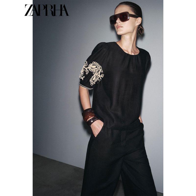 Zaprha 2025 Summer New Western Style Linen Blend round Neck Puffy Short sleeve Embroidery Top 2731105