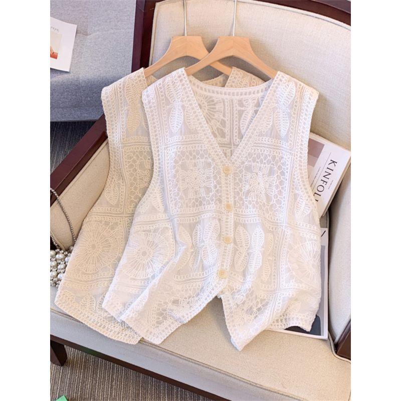 Plus Size Women's Clothing Fat Sister Summer White V-neck Single-Breasted European French Hollow Sleeveless Cardigan Vest L-4XL