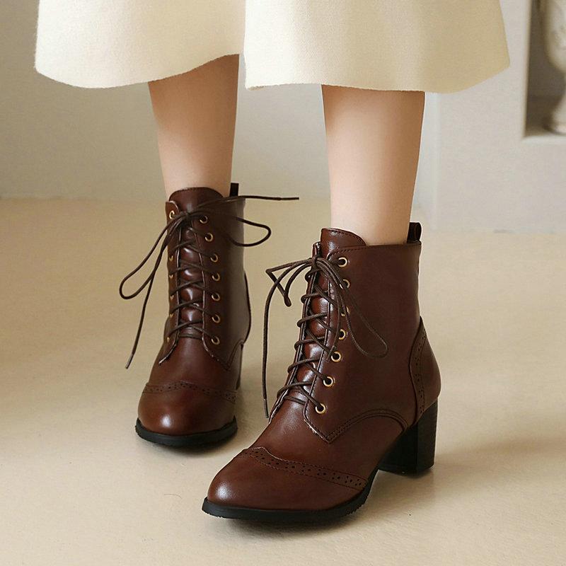 Podzim Zima Dámské Boty Módní Hnědé Černé Bílé Šněrovací Kotníkové Boty na Vysokém Podpatku pro Ženy Motorkářské Kotníkové Boty Dámské Boty 34-48