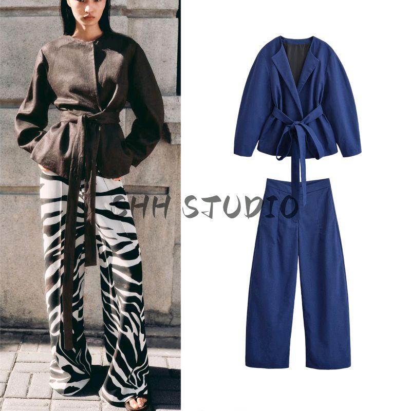 Linen Blend with Belt round Neck Kimono Coat 8426329 Balloon Mid Waist Pants 7627242