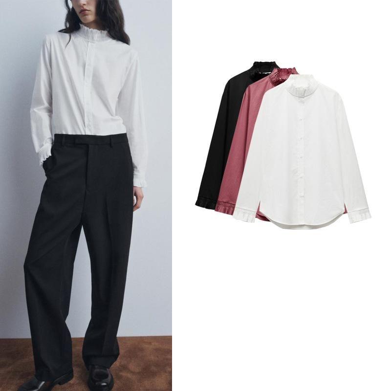 Fall and Winter New Women's Clothing Fashion Style Cotton Small Pleated Laminated Decoration Stand Collar Long Sleeves Shirt 4786277
