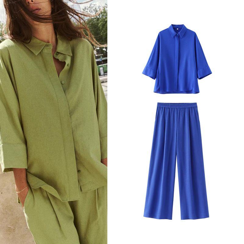 Spring New Casual Polo Collar Long Sleeves Linen Blended Loose Shirt 2157045 Wide Leg Pants 3108709