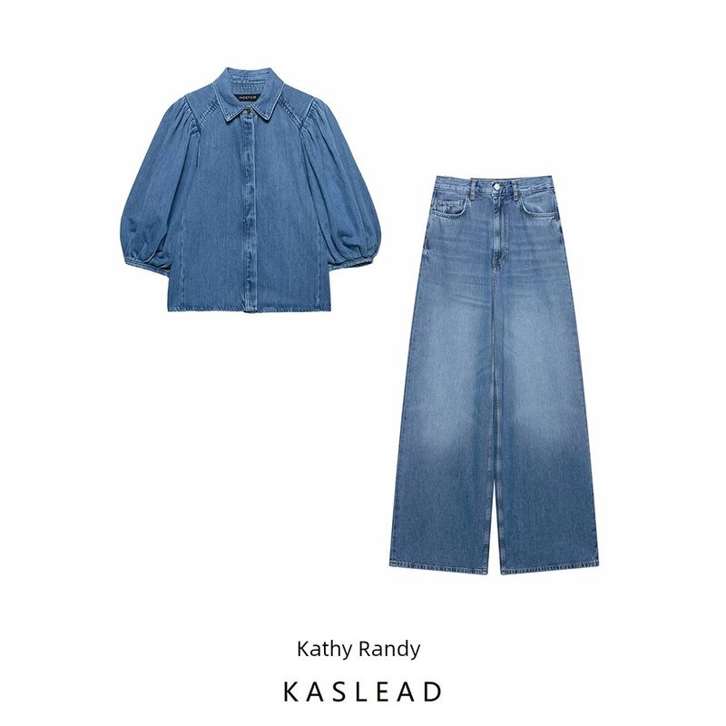 Kaslead New Arrival Women's Fashion Style Fashion Short Sleeve Denim Shirt Pants 5216053 6840055