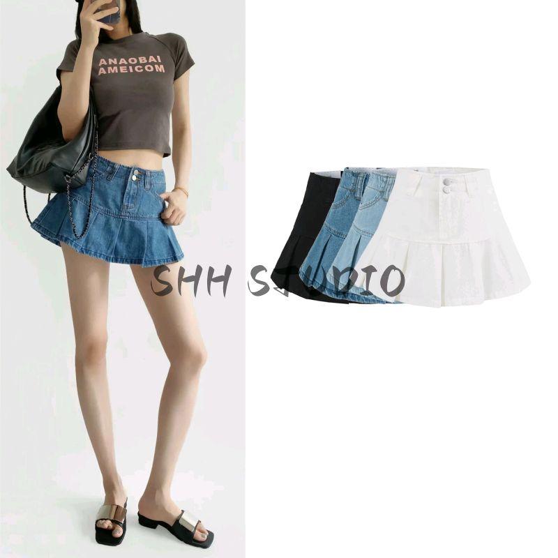 Summer New Product Women's Clothes American Sexy Style Two-Button Pleated A- line High Waist Slimming and Short Denim Skirt