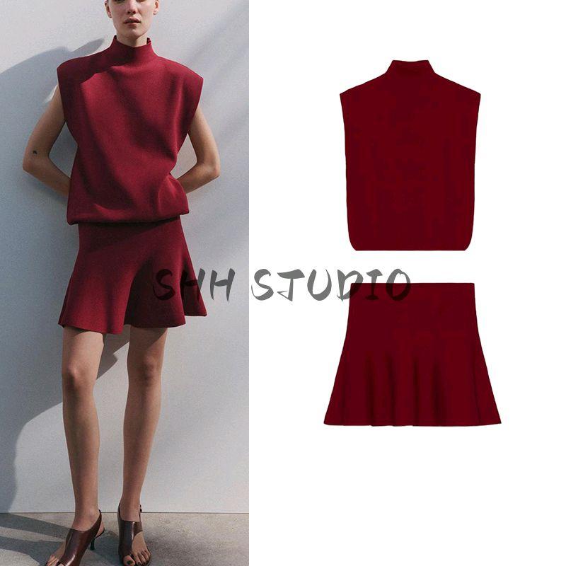 Simple Graceful Stand Collar Short Sleeve Tops 3519003 Plain Stitch A- line Hem Mini Skirt 3519004