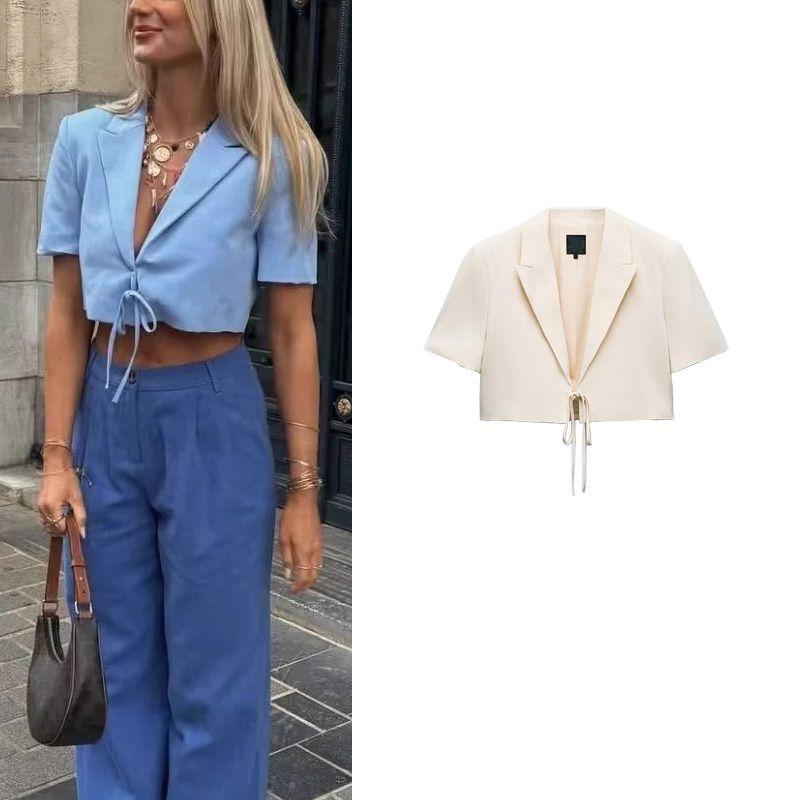 Spring New Versitile Fashion V-neck Short sleeve with Shoulder Pad Bowknot Decoration Short Blazers 8338711