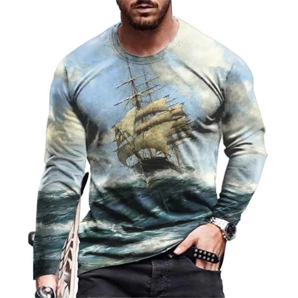 Navigation Sailing Ship3D Digital Printed Men's Fashion Trend Round Neck Long Sleeved T-shirt
