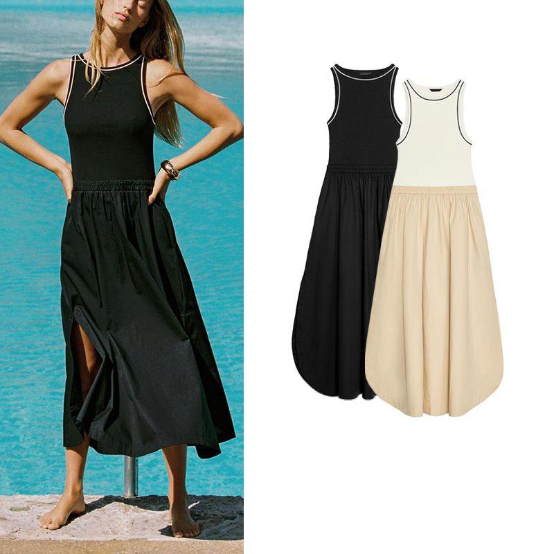 Summer Women's Clothing Contrast Color Rolled Trim Patchwork Sleeveless round Neck Midi Skirt Dress 8372046 8351047