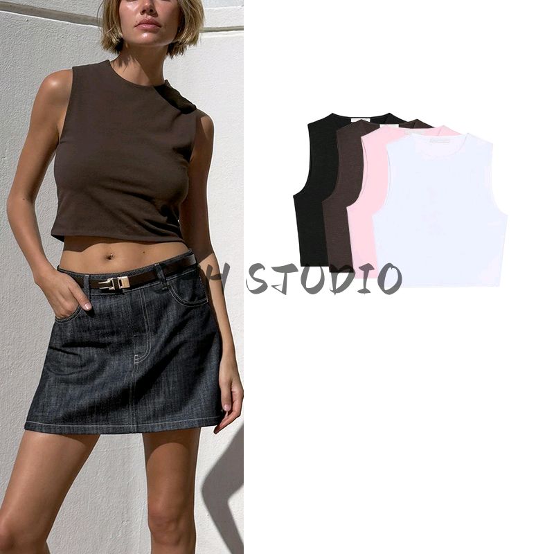 Spring and Summer New Women's Clothing American Casual Style Easiest for Match round Neck Sleeveless Cotton Short Tops 2335353
