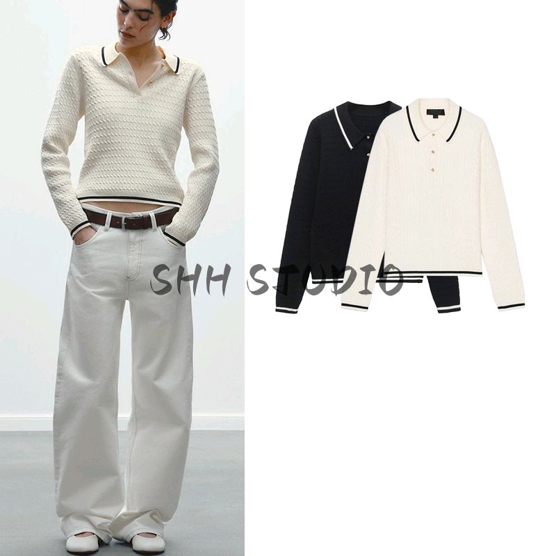 Spring New Women's Clothing Preppy Style Contrast Color Trim Minimalist Long Sleeve Polo Shirt Collar Sweater 6771055