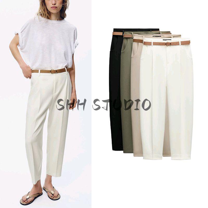Spring New Women's Clothing Commute Leisure Multi-Color Matching Belt High Waist and Ankle Elegant Pleated Pants 9929022