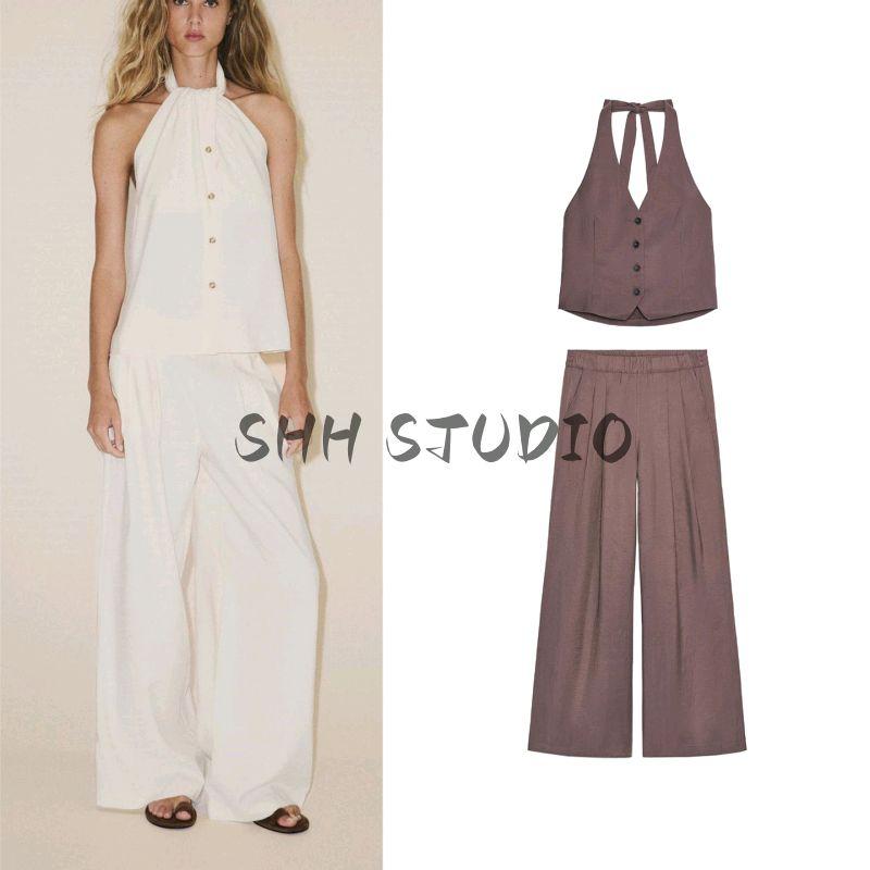 Hanging Collar Bowknot Decoration Vest 2010809 Vertical Fabric Mid Waist Wide Leg Casual Trousers 8338504