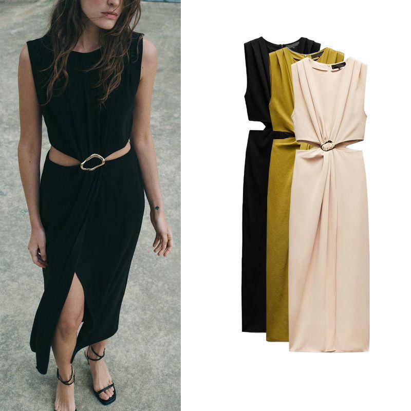 Spring New Women Opening Design Buckle Decoration Black Sleeveless Long Dress 2298176 5029167