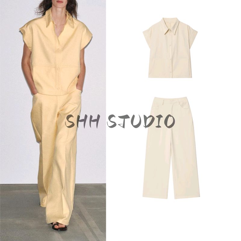Cotton Blend Lapel Sleeveless Drop Shoulder Design Loose Vest 5216065 Mid Waist Wide Leg Trousers 5216064
