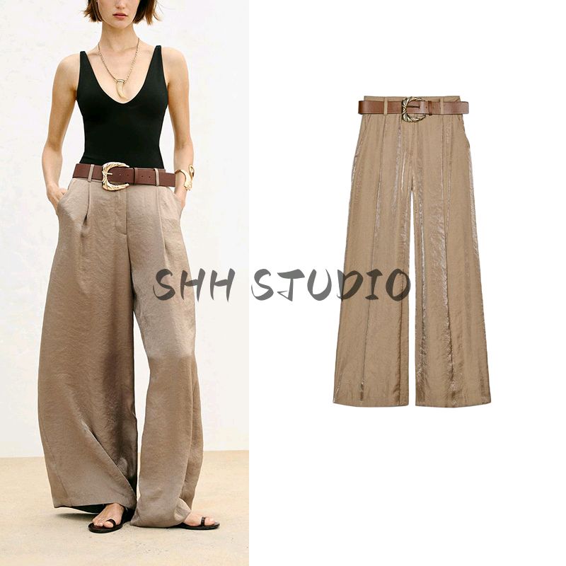 Summer Women's Pleated Decoration High Waist Vertical Matching Belt Silk Satin Texture Wide-Leg Casual Pants 3533556