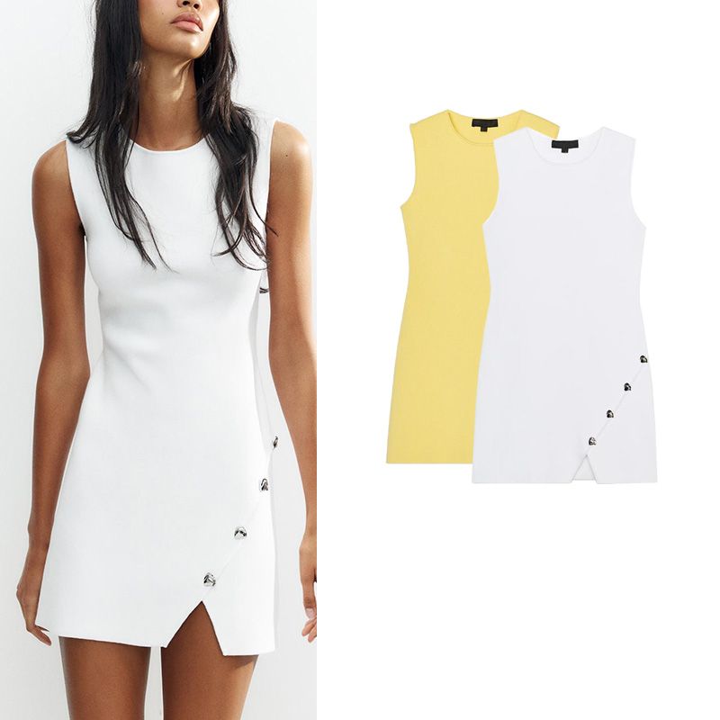 Summer New Product Women's Clothes Fashion Asymmetrical Decorated Row Button Short Knitting Dress 9598102 9598074