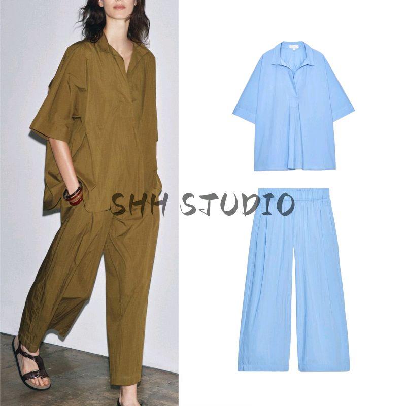 Cotton Blend Loose V Neck Short Sleeve Shirt 5344118 High Waist Poplin Pleated Casual Pants 2731249