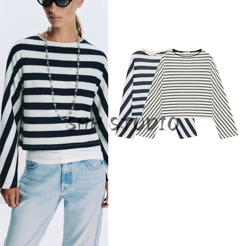 Fall New Women's Clothing French Cotton Loose round Neck Batwing Long Sleeve Stripes Fashion Tops 1165260