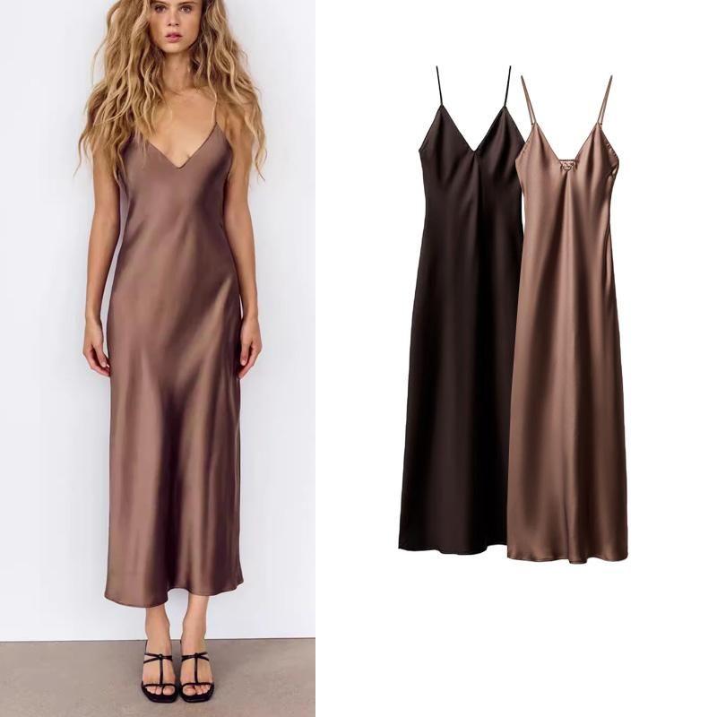 Spring New Women clothes V-neck Sling Underwear Silk Satin Texture Midi Long Dress 3067374