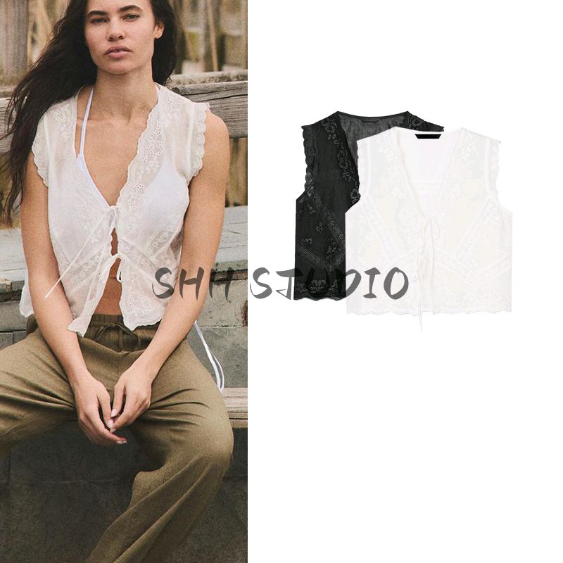 Spring and Summer New Women's Clothing Minimalist Wind Easiest for Match Bows Cotton Blend Embroidered V-neck Sleeveless Tops 0881017