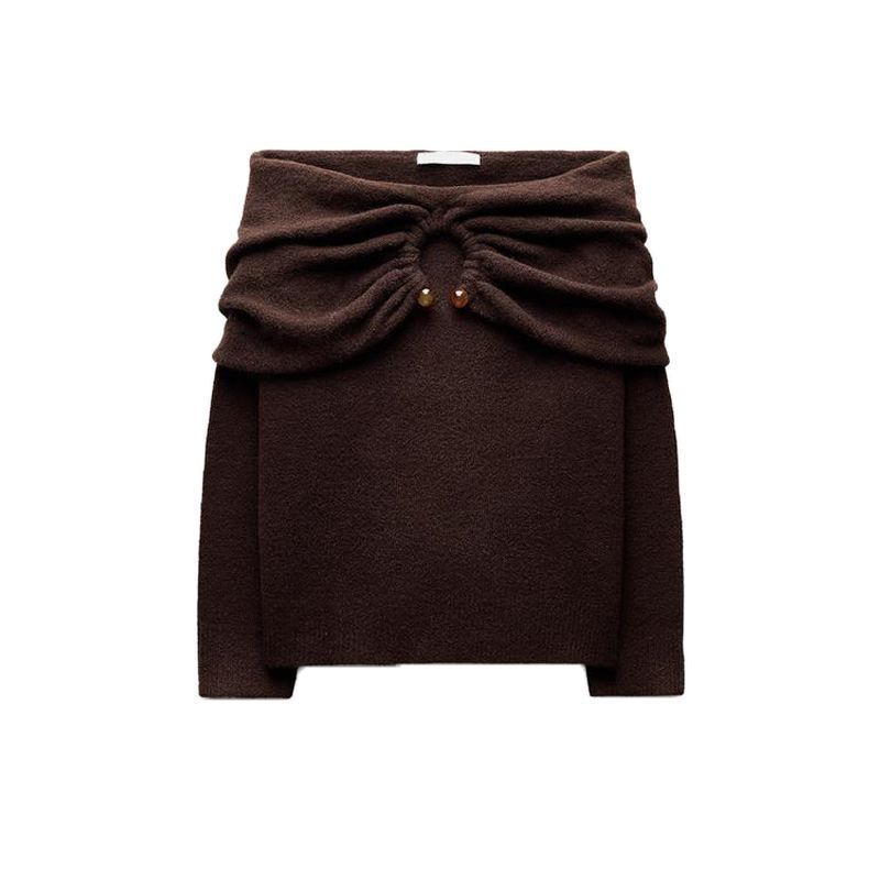 Fall and Winter New Women's Clothing French Style Temperament Curling Neckline Straight Collar Long Sleeves Shoulder-Baring Sweater 3653116