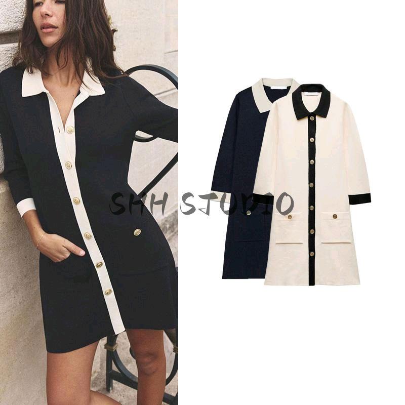Spring New Women's Clothing French Style Classic Style Lapel Gold Decorated Row Button Knitting Short Dress 1822101