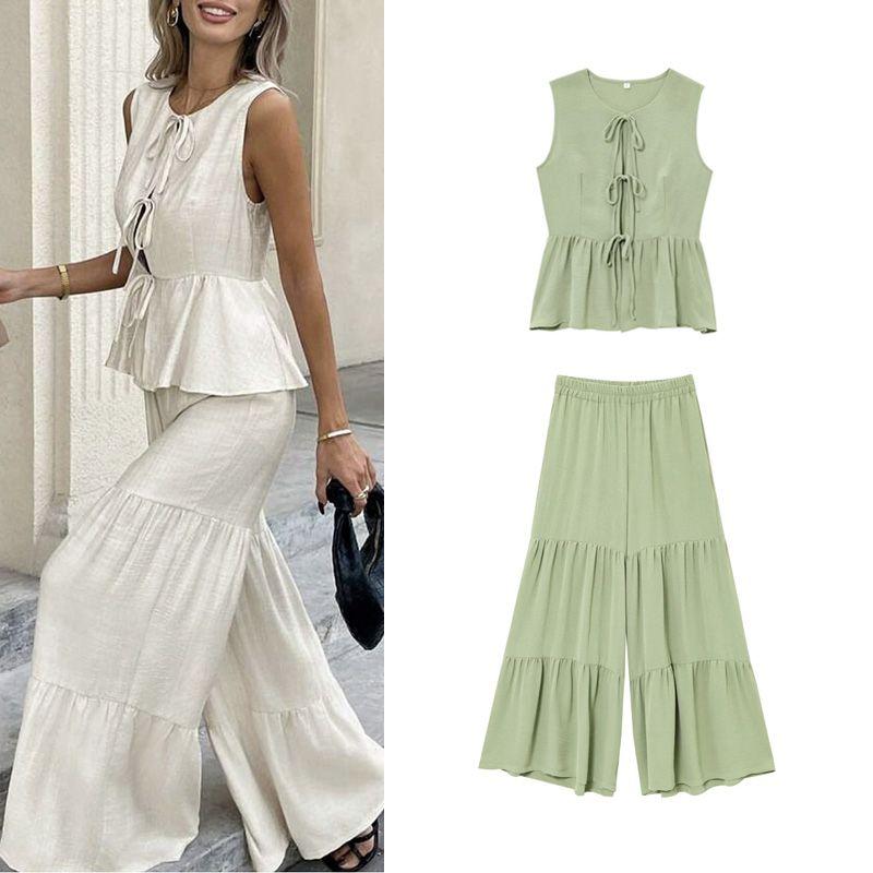 Spring and Summer New Women's Clothing Minimalist Wind round Neck Sleeveless Short Shoelace Tops Loose Vertical Horn Pants