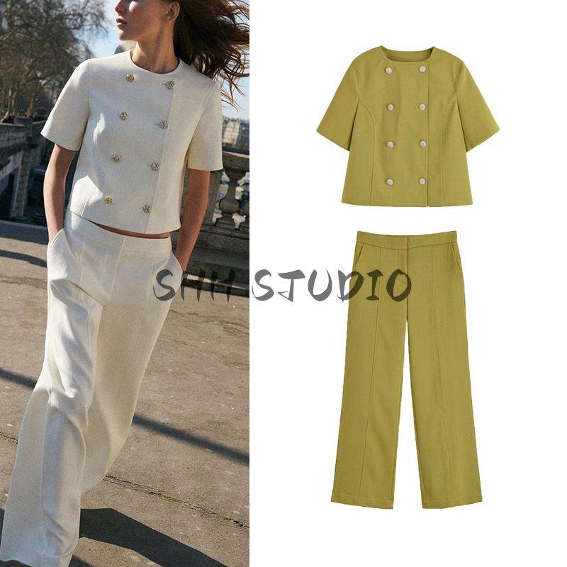 Short Sleeve round Neck Double Breasted Decorated Row Button Tops 2902835 High Waist Straight-leg Minimalist Casual Pants 2899835