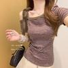 Kumikumi Sweet and Spicy Style Sloping Shoulder Strap Short sleeve T-shirt Women Summer Retro Stripe Slimming All-Match off-Shoulder Top