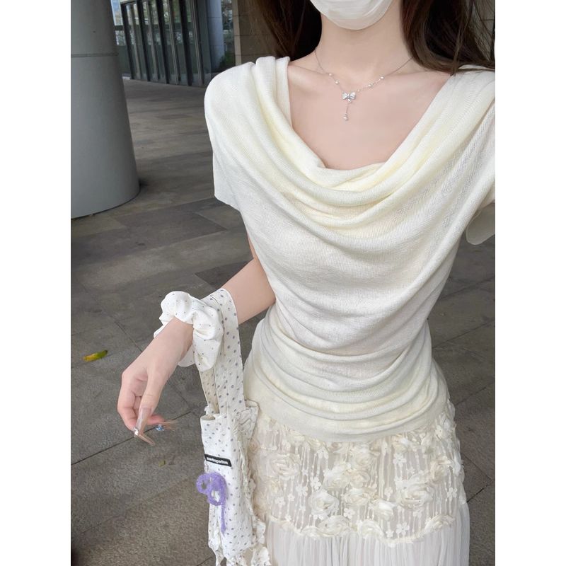 Kumikumi Gentle Wind Solid Swing Collar Knitted Short sleeve T-shirt Women Summer French style Age-Reducing Waist Hugging Slimming Top
