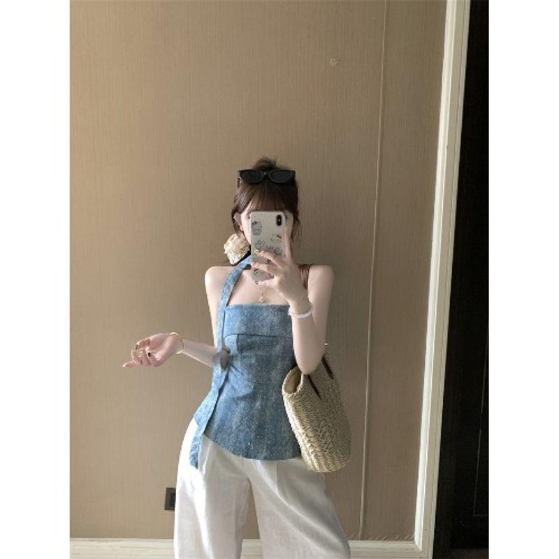 Kumikumi Retro Distressed Washed Hot Drilling Denim Tube Top Women clothes Summer Sexy Waist Hugging Slimming Versatile Vest