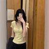 Kumikumi Pure Desire Style Lace Yellow V-neck Short sleeve T-shirt Women clothes Summer Slim fit Slimming Versatile Top