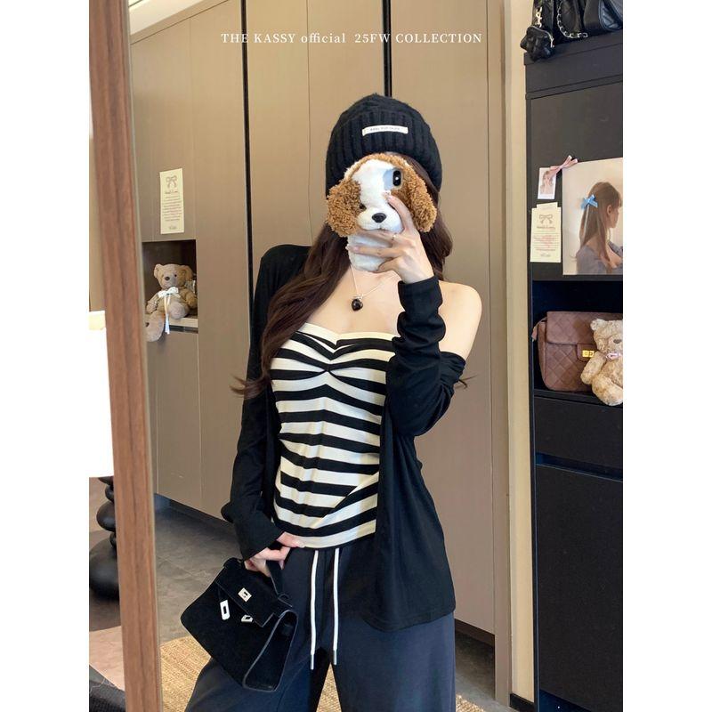 Kumikumi Stylish Thin Black Long Sleeve Cardigan Jacket Women's Clothing Autumn Inner Wear Stripes Tube Top Two-piece Set