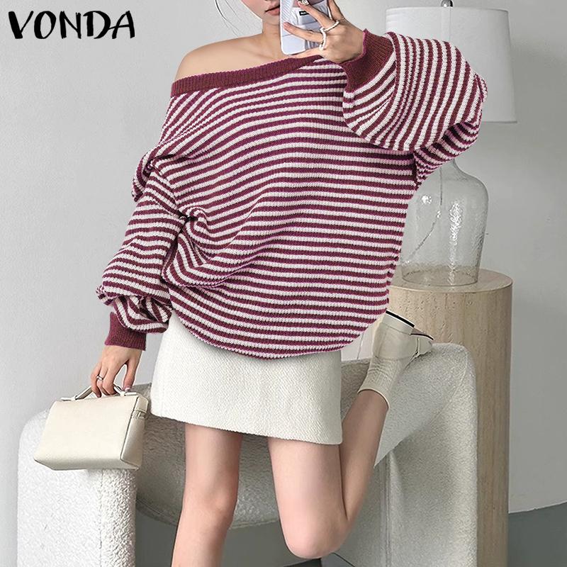 VONDA Women Jumpers Long Sleeve Striped Knitted Pullover Sweaters Knitwear
